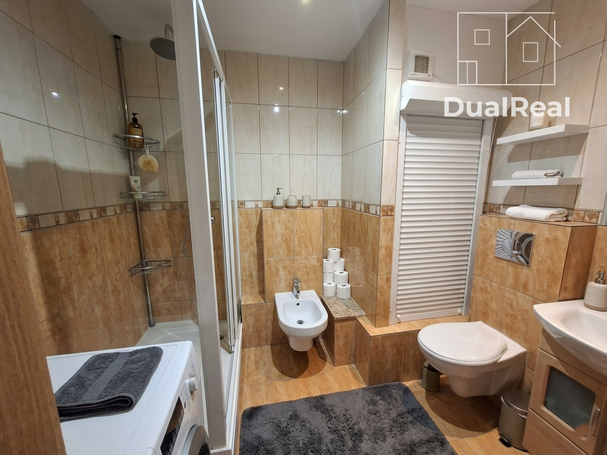 - kúpeľňa disponuje sprchovým kútom, umývadlom so skriňou, toaletou a súčasťou je aj bidet